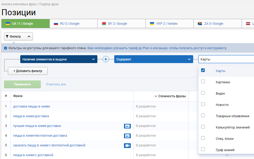 В этом Вам поможет один из сервисов для сбора ключевых слов и проверки позиций, например, Serpstat. В его панели инструментов нужно выбрать пункт «Подбор фраз» и дополнить стандартные результаты фильтром «Карты».