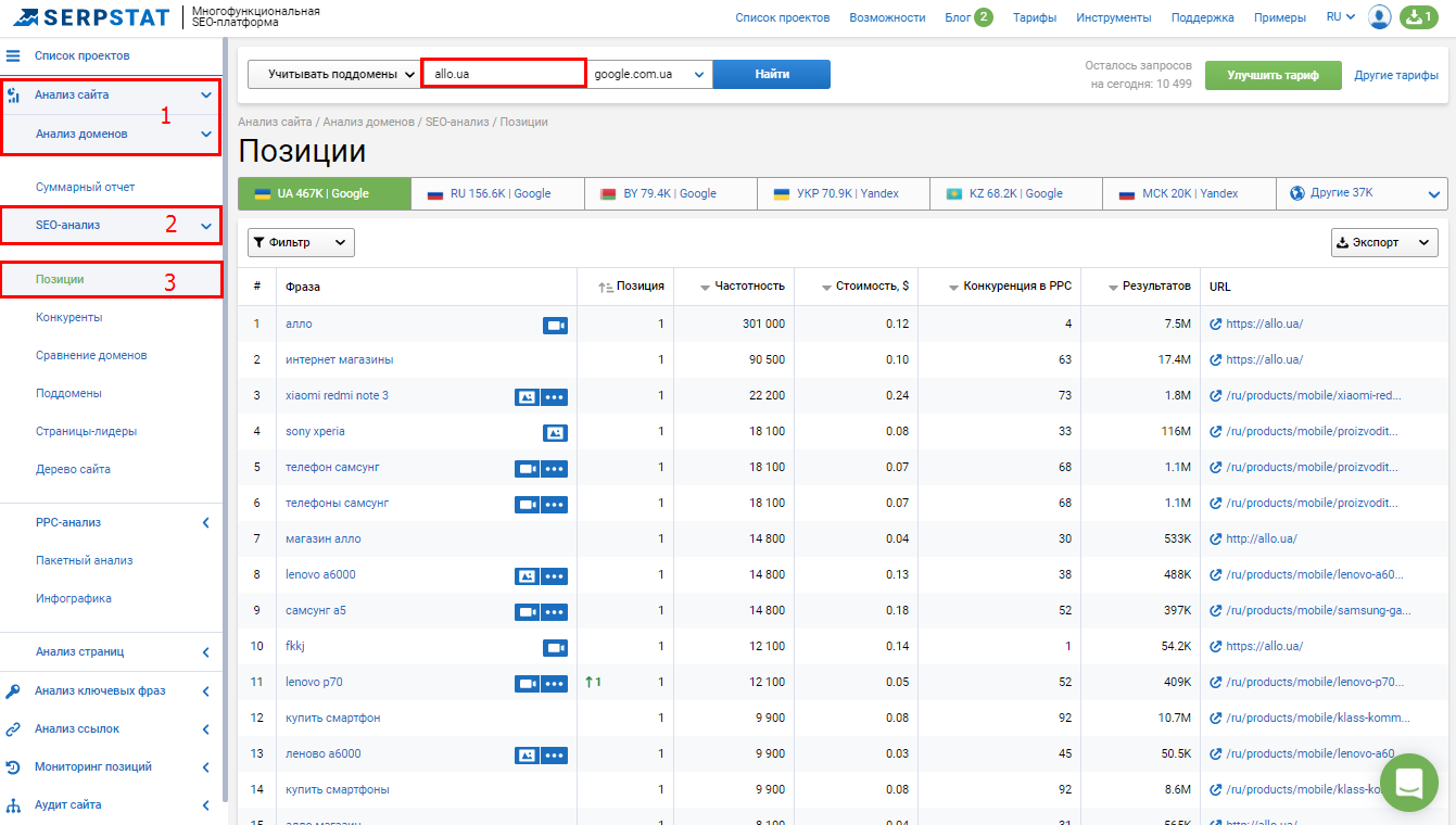 С помощью Serpstat можно проанализировать ключевые слова любого конкурента. Для этого нужно вставить ссылку конкурента в сервис и открыть инструмент “Анализ домена — SEO-анализ — Позиции”.