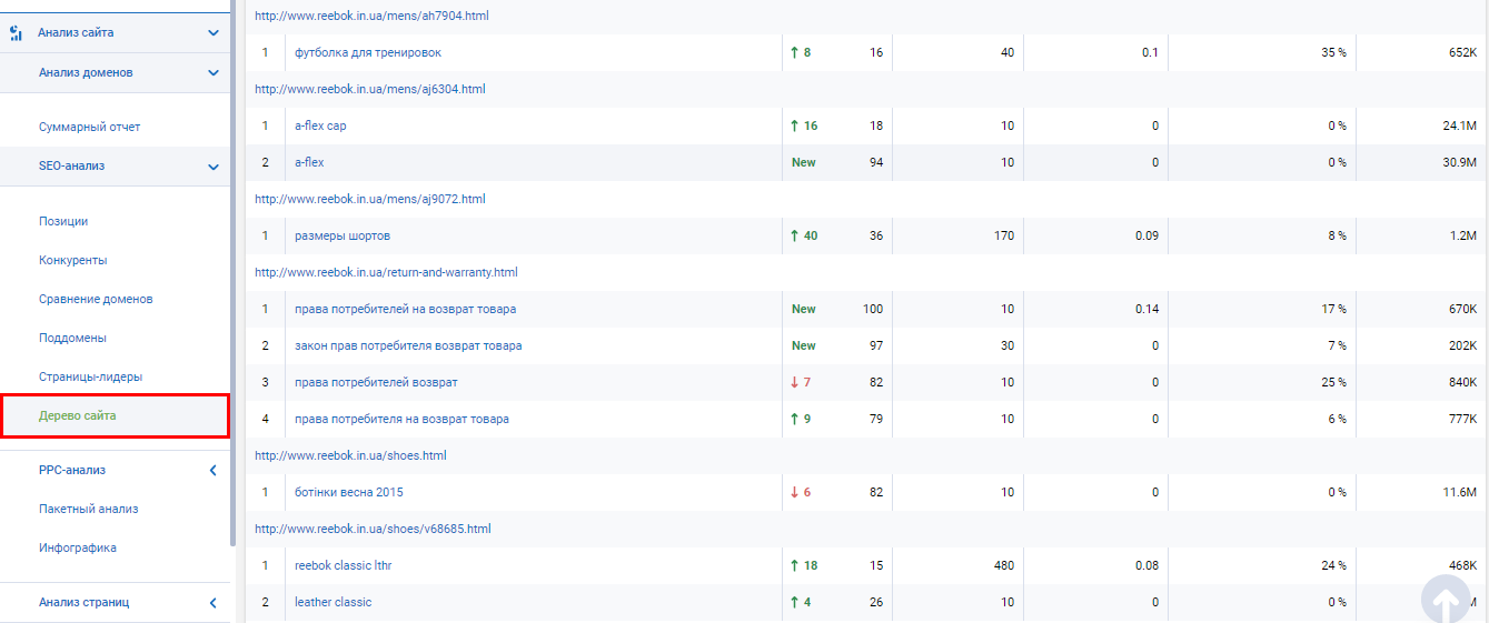 Инструмент “Дерево сайта” показывает постраничное распределение ключевых слов на сайте.