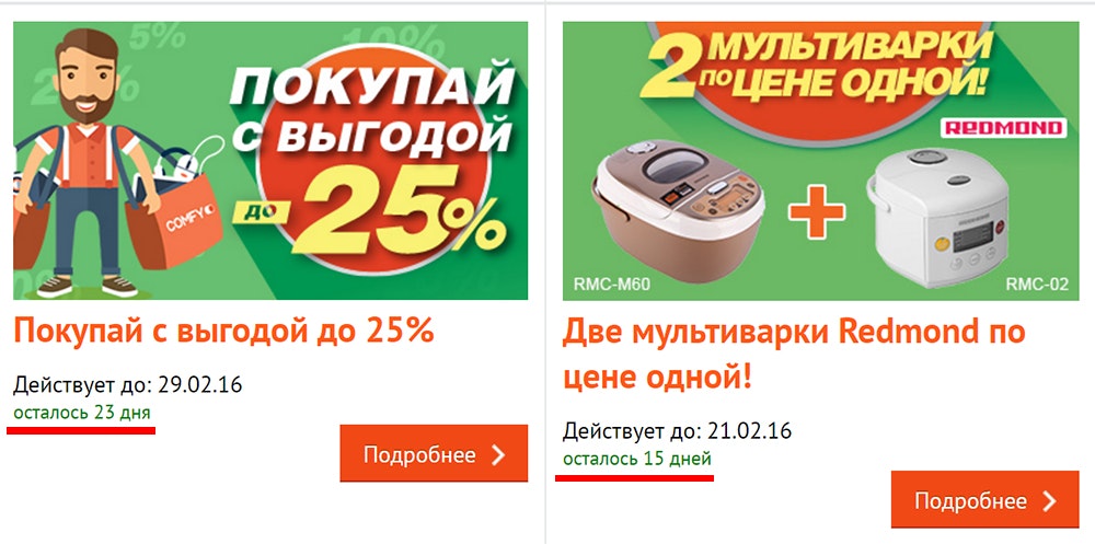 Особый эффект иногда дает триггер на сайте в виде таймера обратного отсчета до конца акции. В этом случае страх не успеть купить что-то по выгодной цене может взять верх над желанием поразмыслить о целесообразности этой покупки.